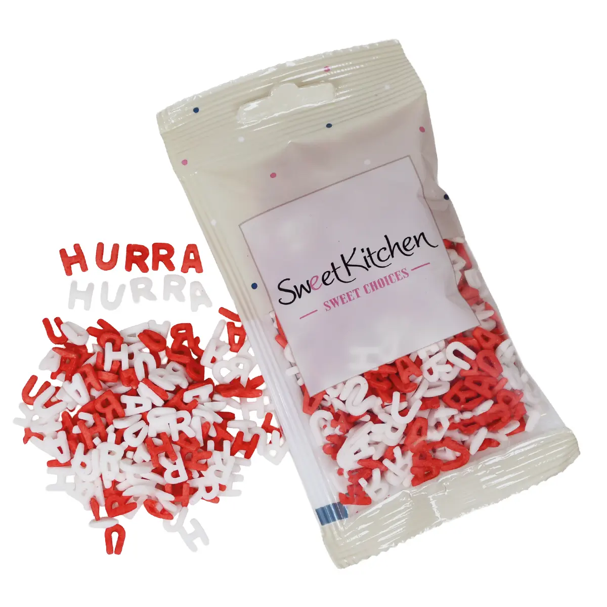 Sweetkitchen egne Hurra mix som er røde og hvide bogstaver til at skrive eller drysse hurra ud på din kage.