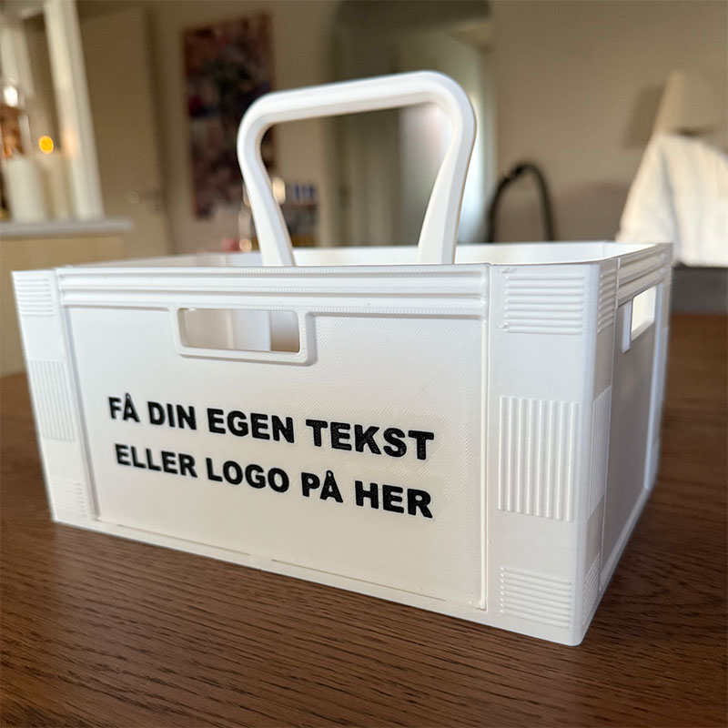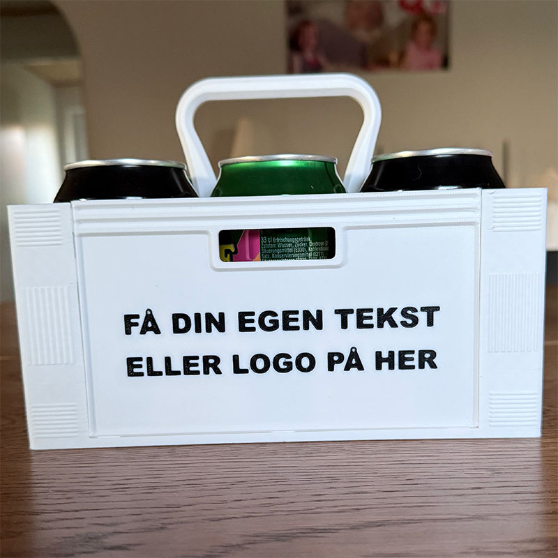 Gør din gave helt unik! Denne 3D-printede ølkasse har plads til 6 dåser (330 ml) og kan tilpasses med din egen tekst eller dit logo – perfekt til firmaevents, gaver, polterabender eller bare for sjov 🍻